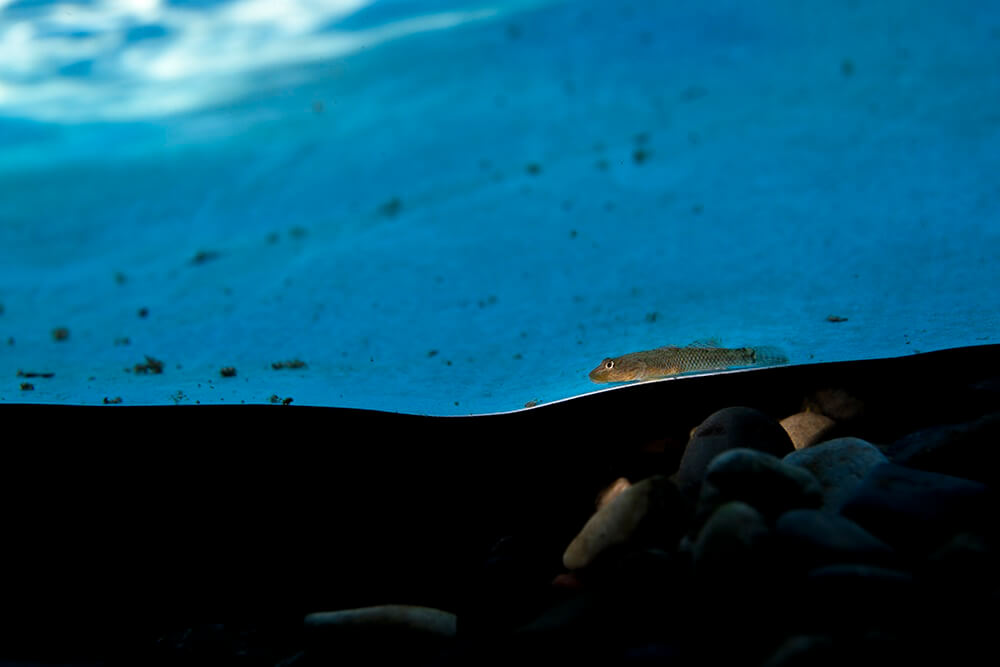 鍵井さんのパネルを川魚が見に来てました